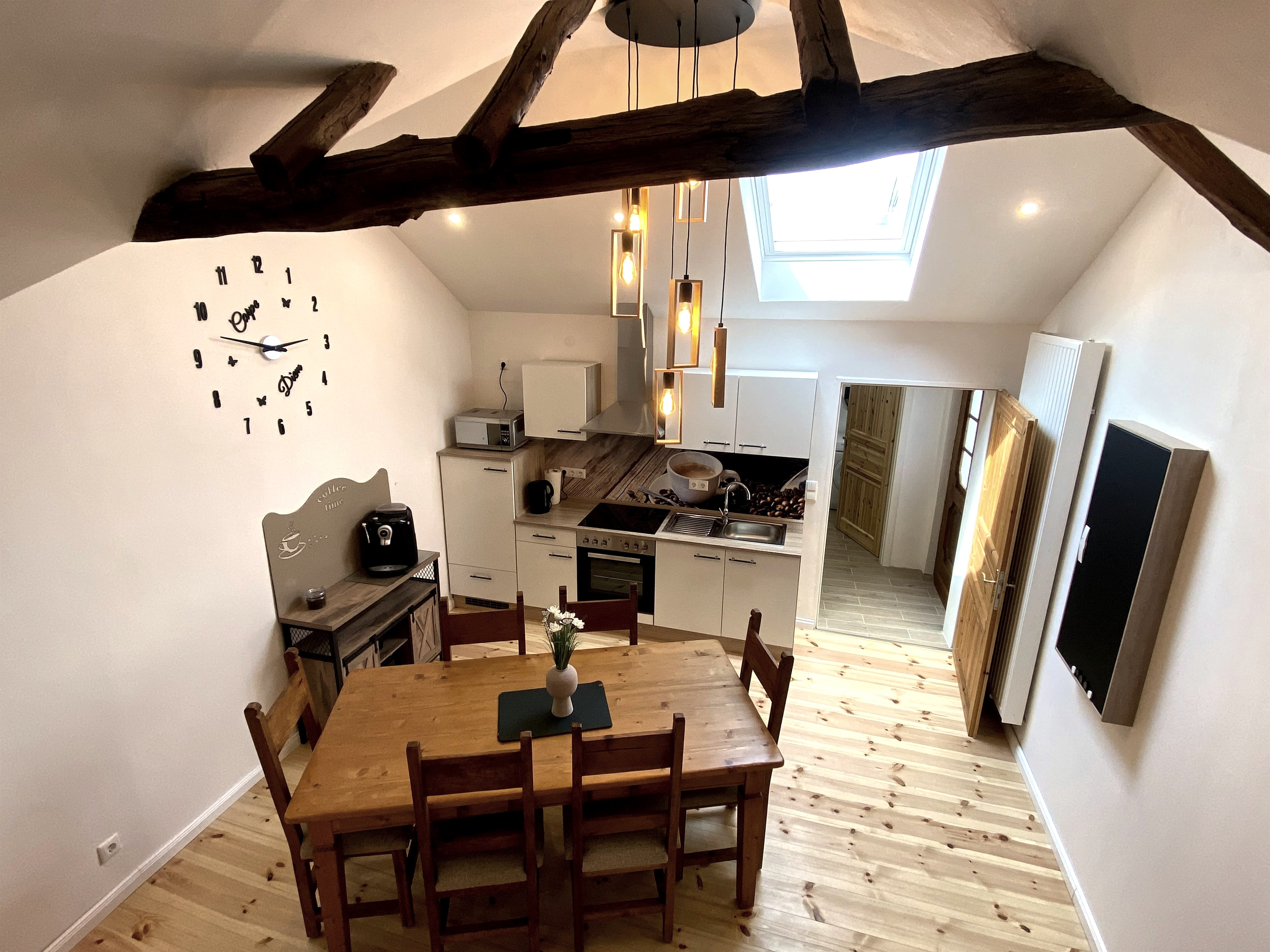 Liebevoll sanierte Ferienwohnung im historischen Fachwerkhaus. Hier trifft Geschichte auf Moderne. Sie erwartet eine große Dusche, Doppel-Schlafzimmer, Schlafbalkon, Wohnbereich mit Schlafcouch und Küchenzeile nebst Sideboard mit Kaffeevollautomat