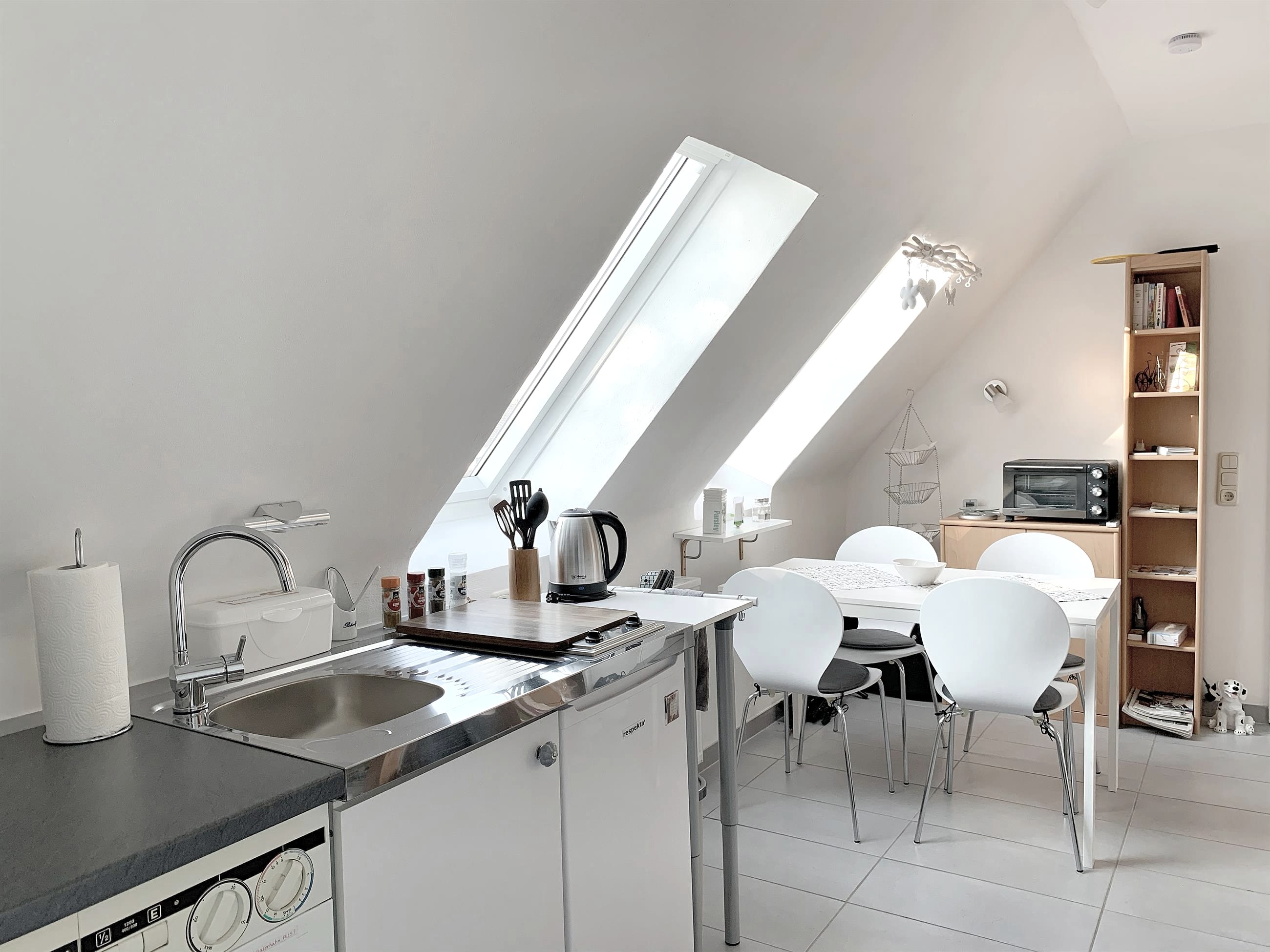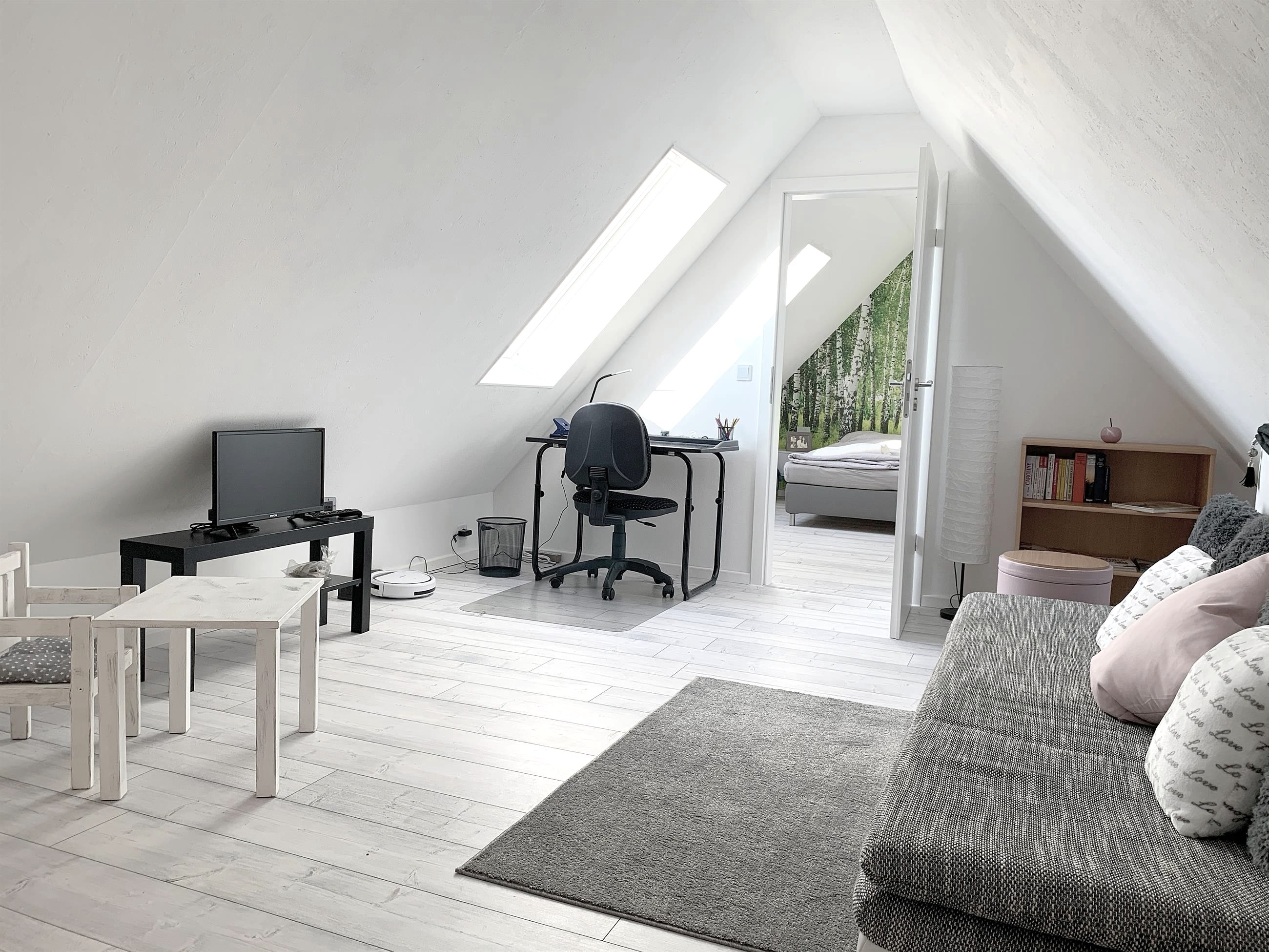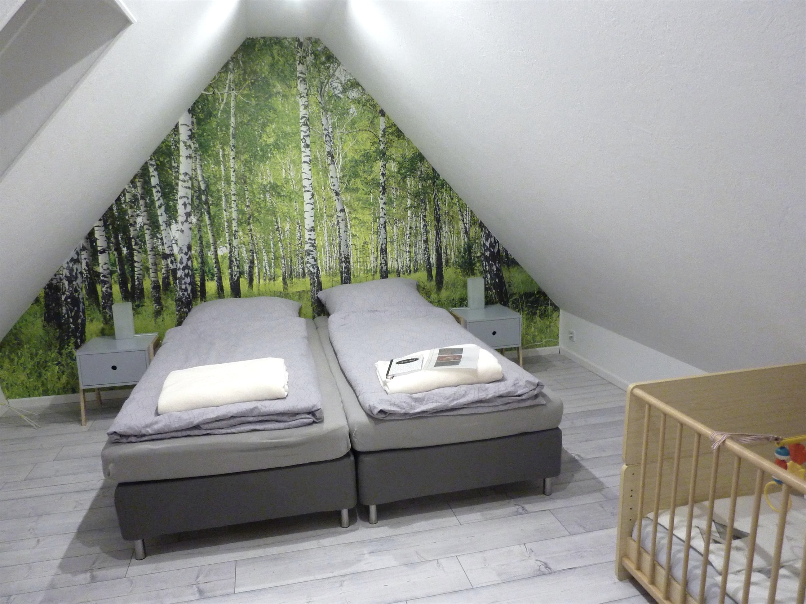 Wir vermieten die gemütliche Eifel-Ferienwohnung "Schöne Aussicht". Die Wohnung befindet sich im Dachgeschoss auf 2 Ebenen. Sie verfügt über 2 Schlafzimmer mit je 2 Betten 90 x 200, einem Kinderbett, einem Wohnraum mit Fernseher, einem Badezimmer mit Dusche und einer Wohnküche mit Pantryküche und Waschmaschine. Die Wohnung ist modern und hell eingerichtet.