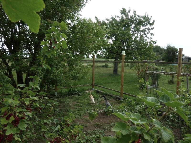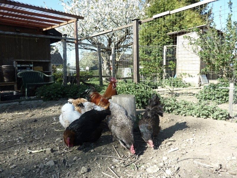 In unserem Garten befinden sich Enten, Hühner und Hunde. Auf den Nachbarwiesen stehen zwei Esel und Ponys.
