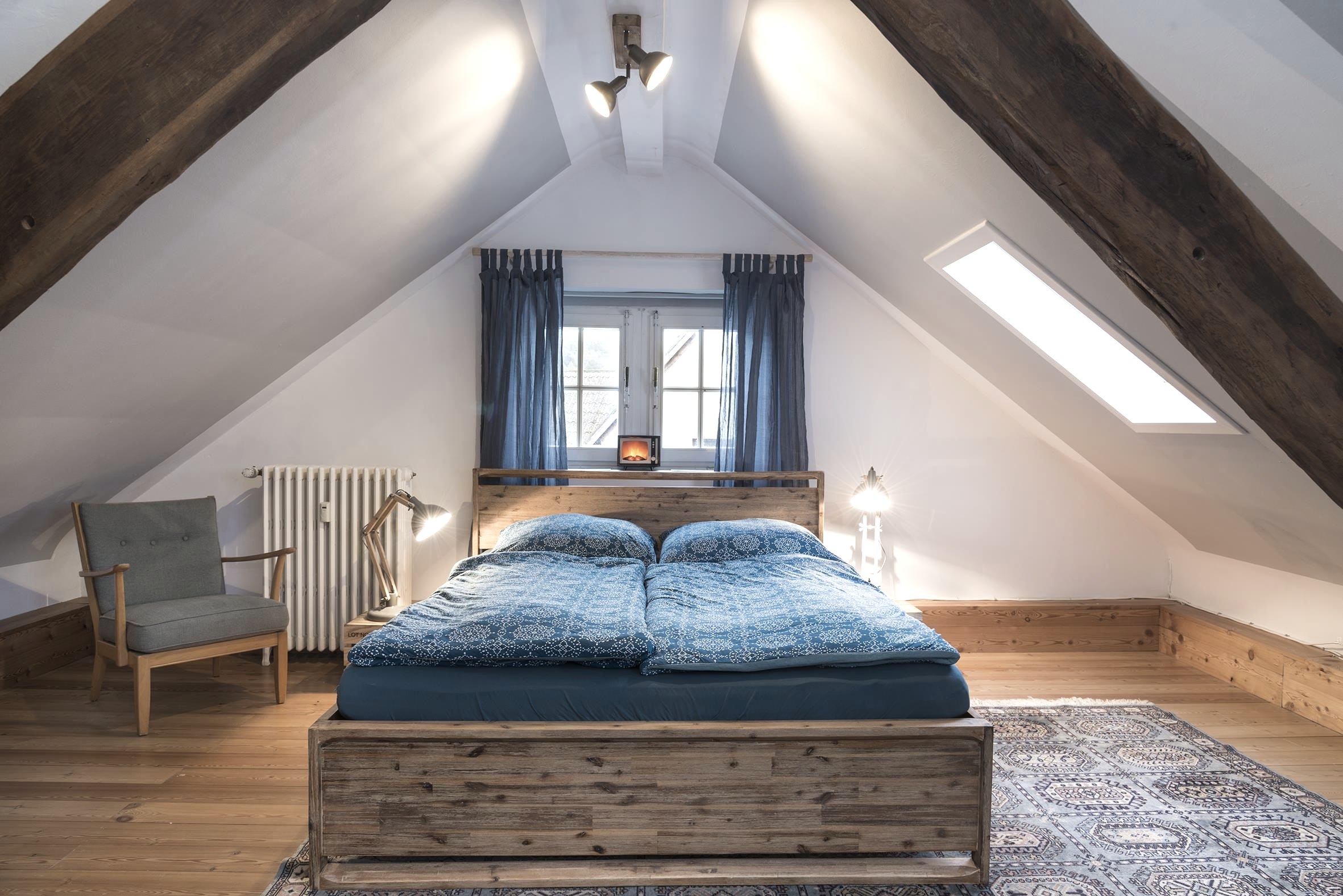 Zudem gibt es ein uriges Kaminzimmer, ein großes Bad mit Badewanne und separater Dusche. Das Schlafzimmer im Dachgeschoss, hat ein zusätzlich kleines Gäste WC. Dieses Schlafzimmer ist nur über eine steile Treppe zu erreichen. Die restlichen Schlafzimmer und das große Bad liegen im ersten Stock. Die Treppe dorthin ist breit, gut begehbar und mit Geländer ausgestattet.