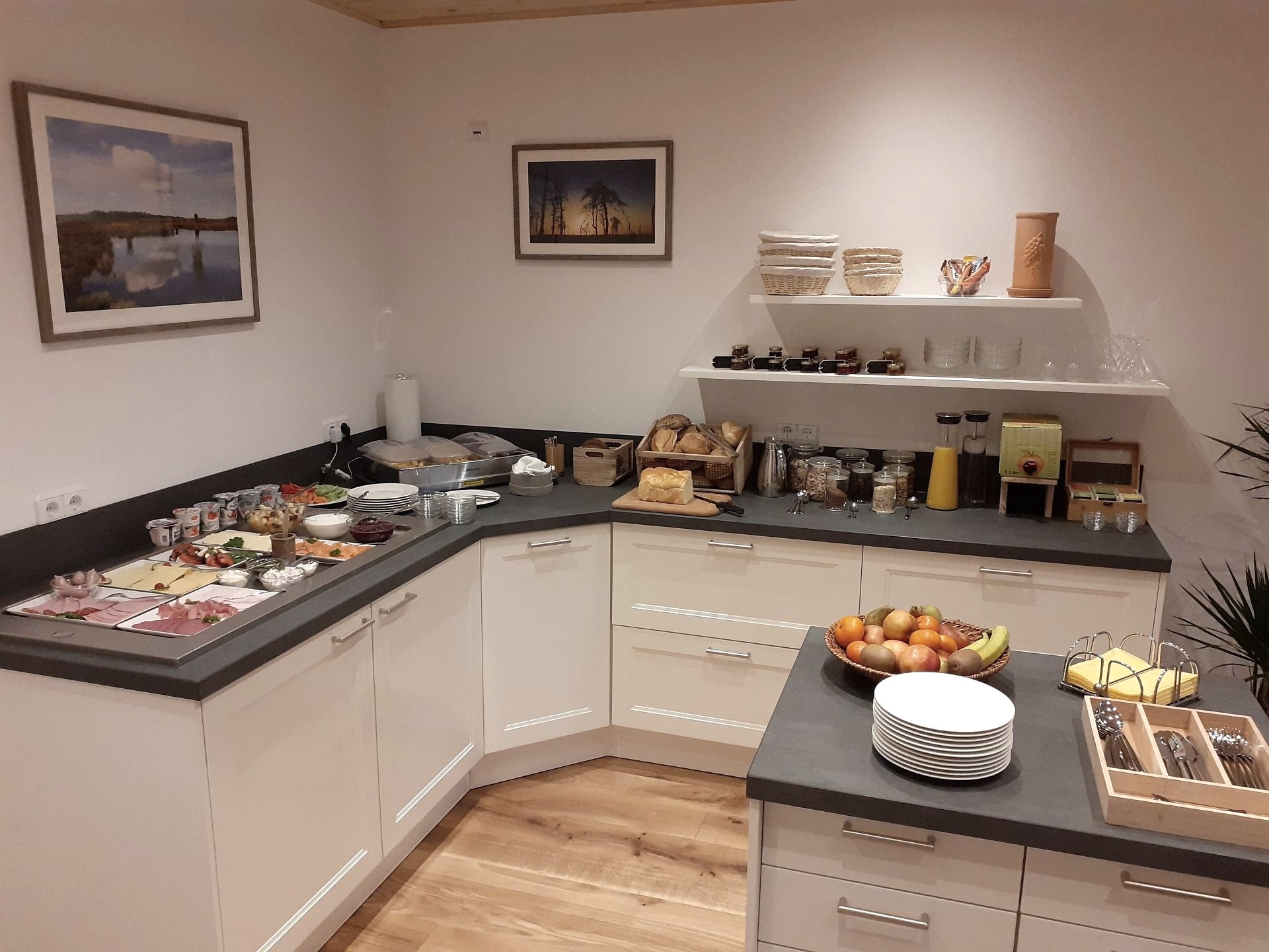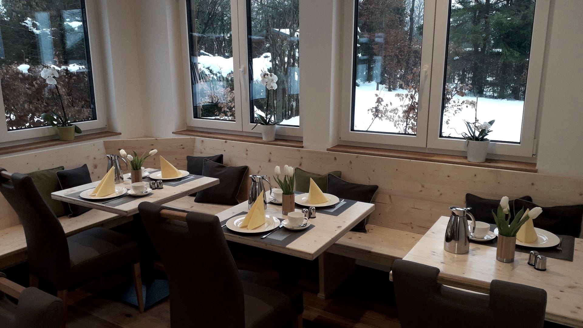 In unserem neuen gemütlichen Frühstücksraum starten Sie, bei herrlichem Blick in die Natur, frisch und ausgeruht in den Tag.