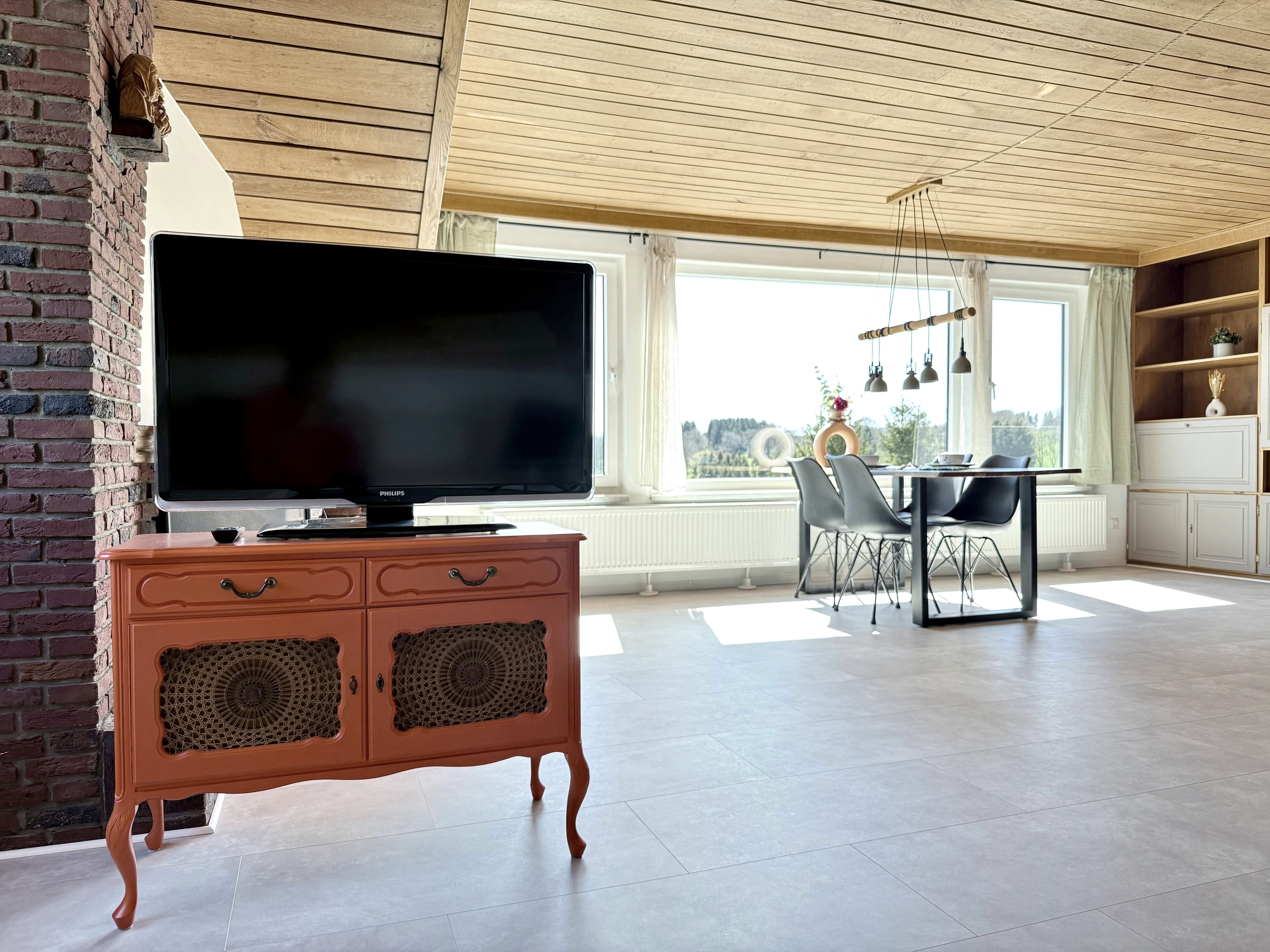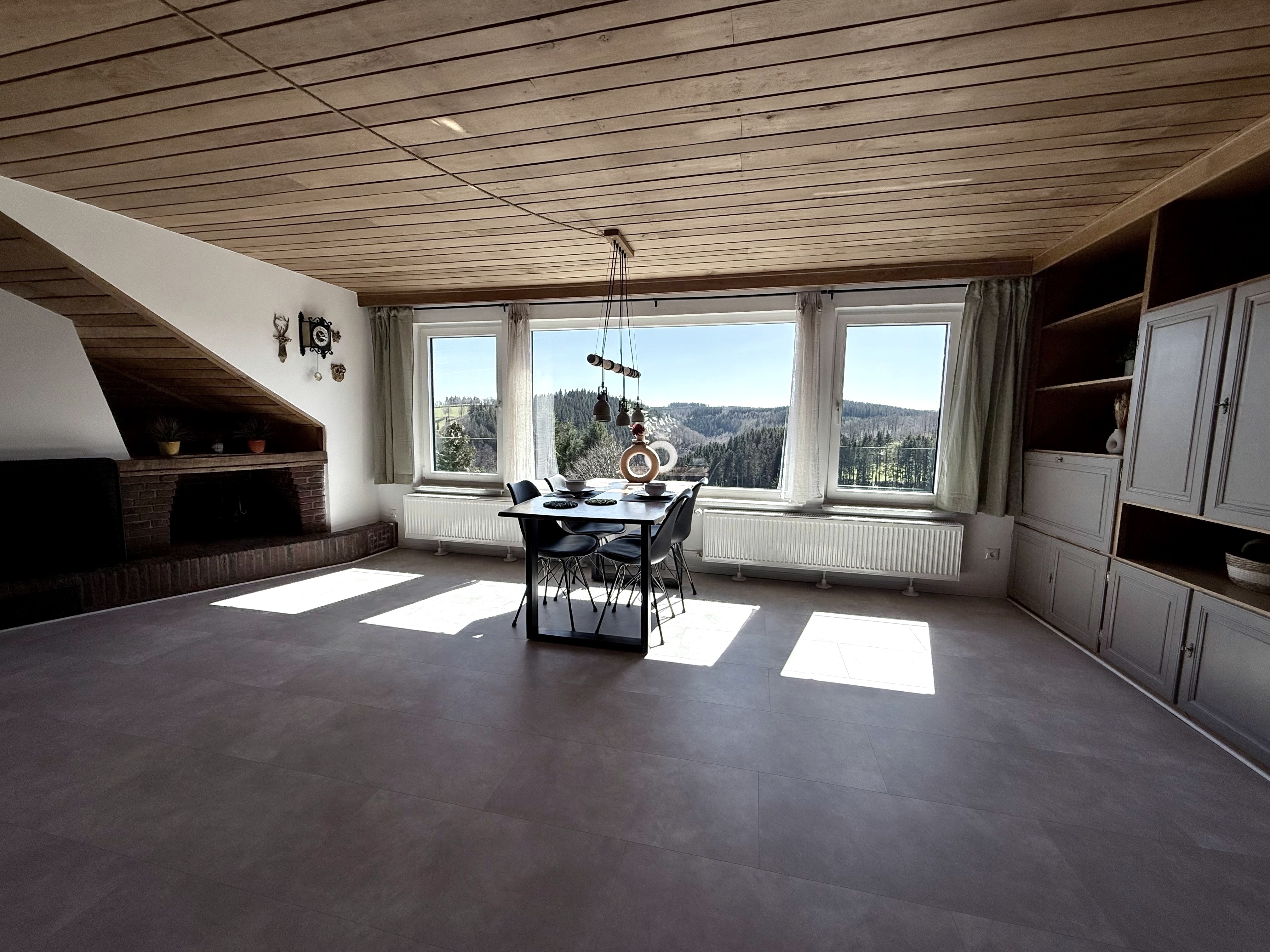 Das geräumige Wohn-/Esszimmer ist mit einem Flachbild-TV ausgestattet und der Deko-Kaminofen im Wohnzimmerbereich sorgt für eine gemütliche Atmosphäre. Vom Essbereich aus genießen Sie einen herrlichen Blick über das Tal von Monschau.