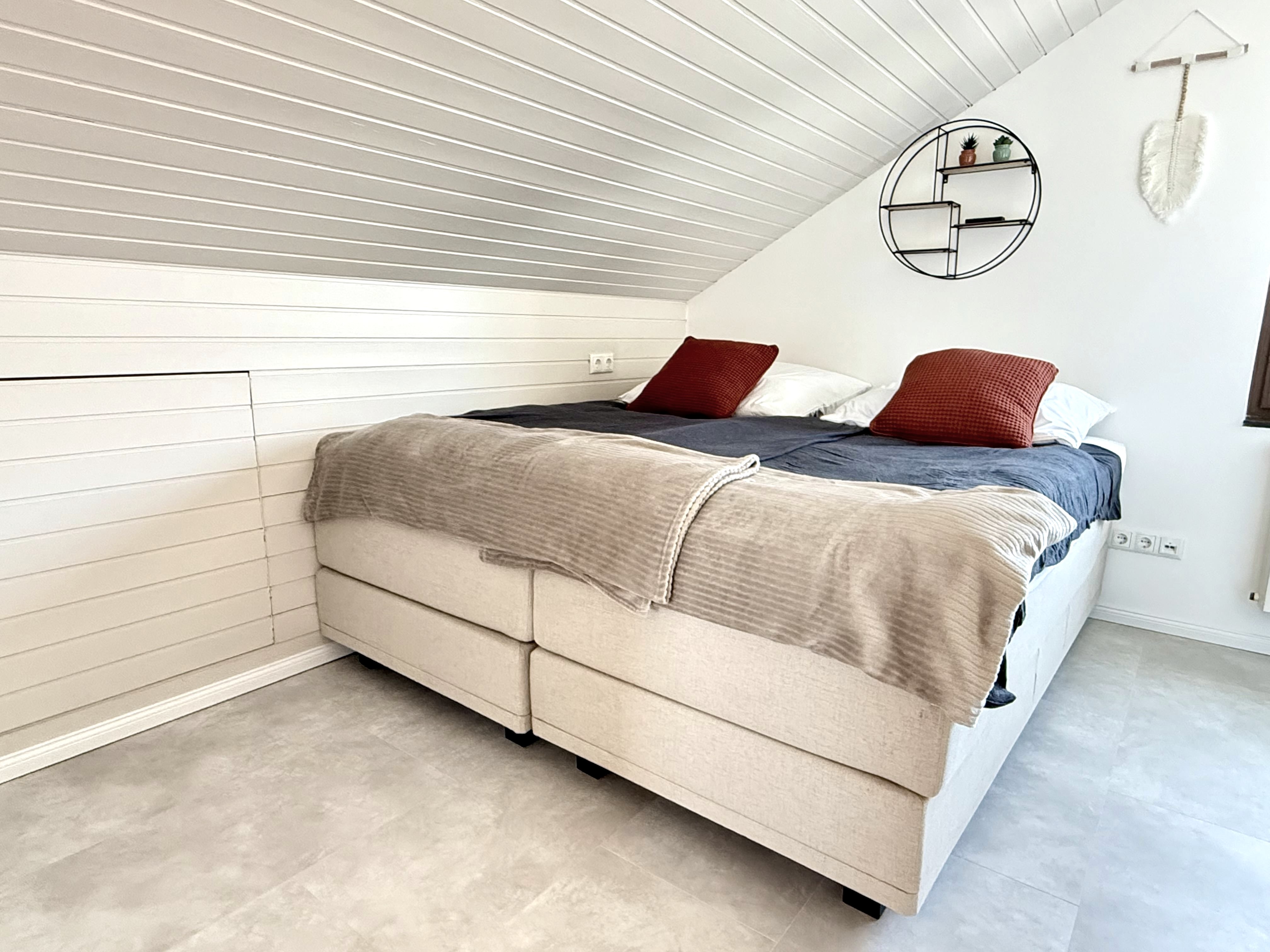 Das gemütliche Schlafzimmer unter der Dachschräge beherbergt ein komfortables Doppelbett (180x200cm) mit hochwertigen Matratzen.