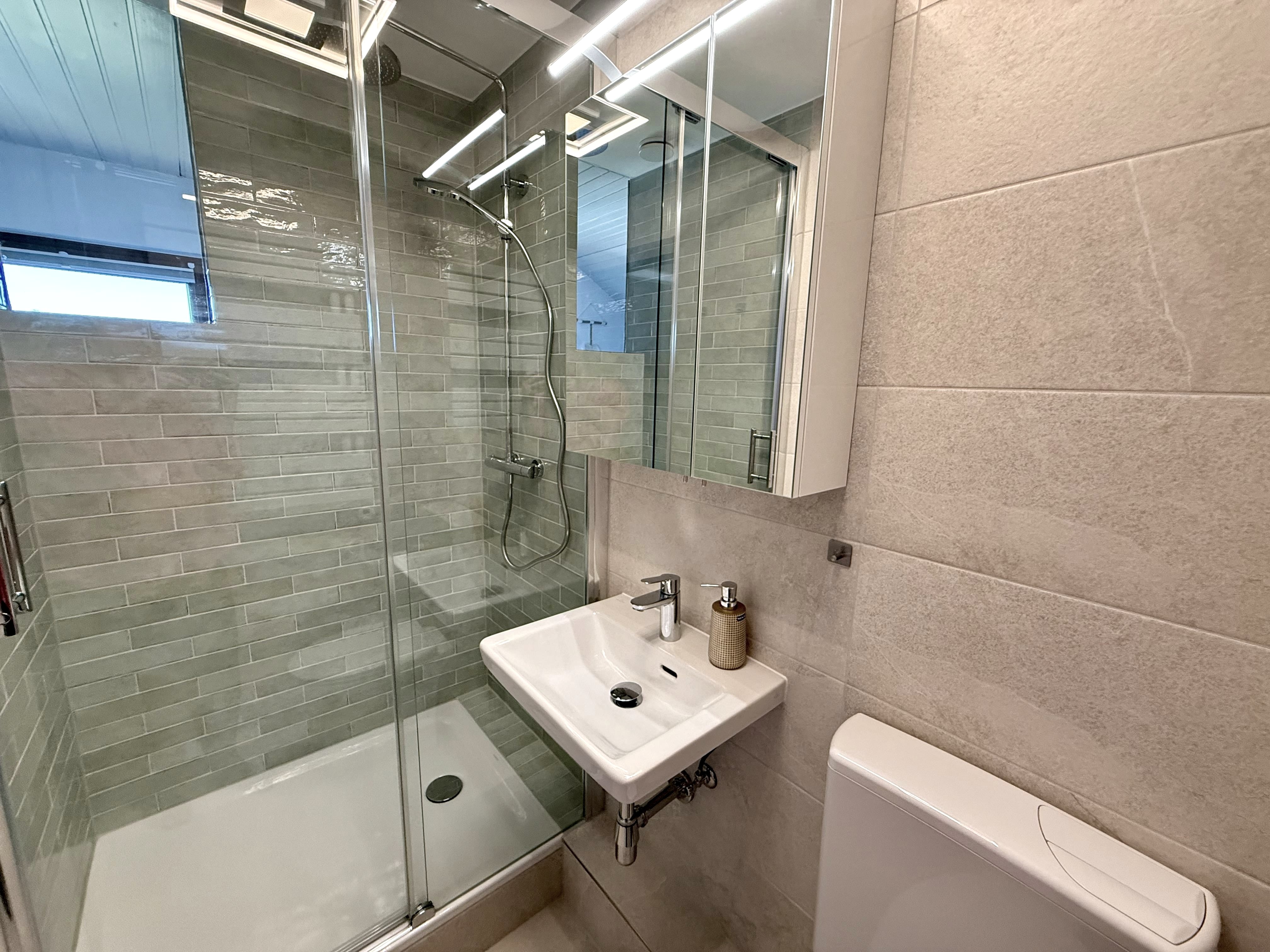 Das moderne Badezimmer verfügt über eine Dusche, ein WC und ein Waschbecken.