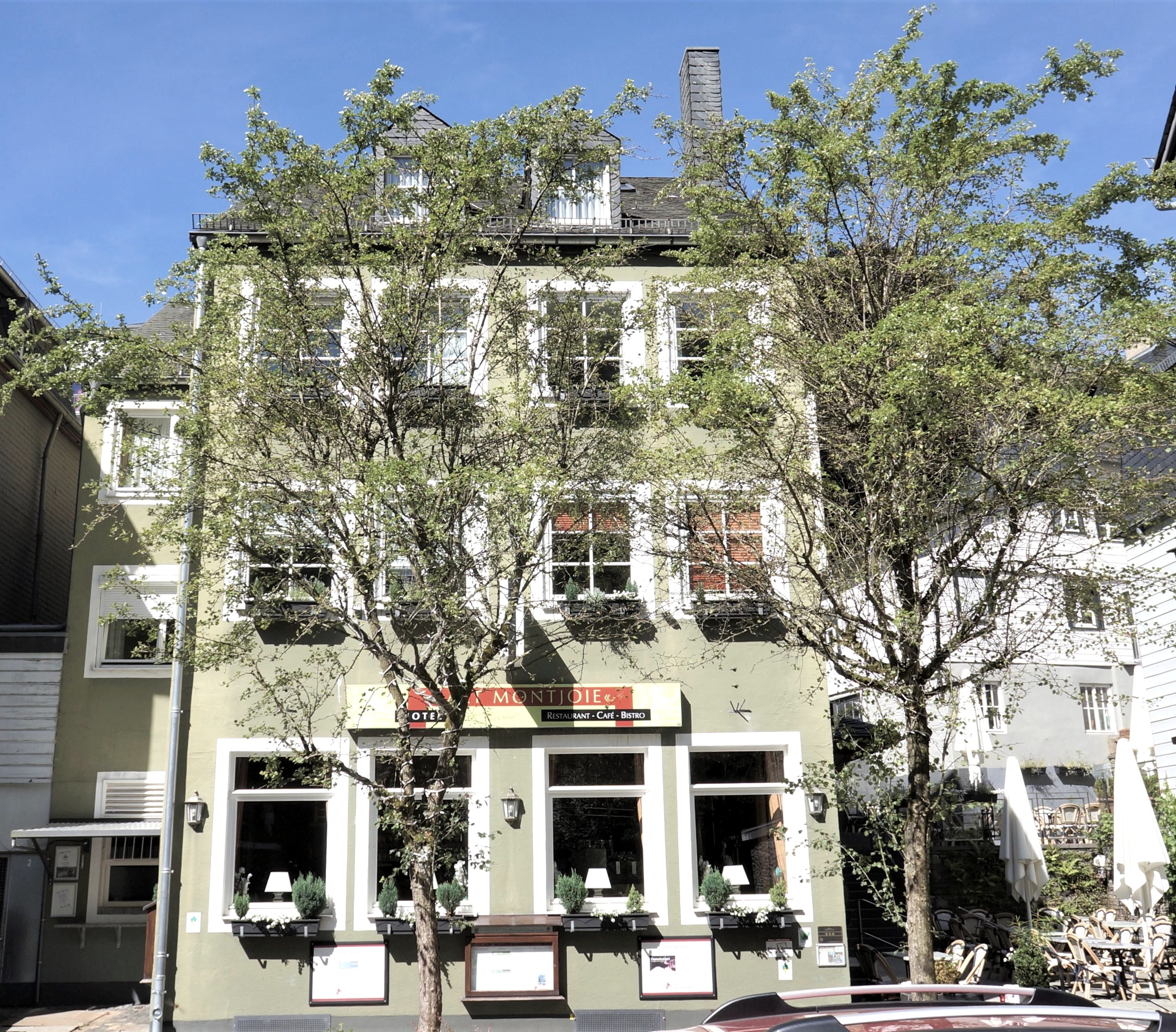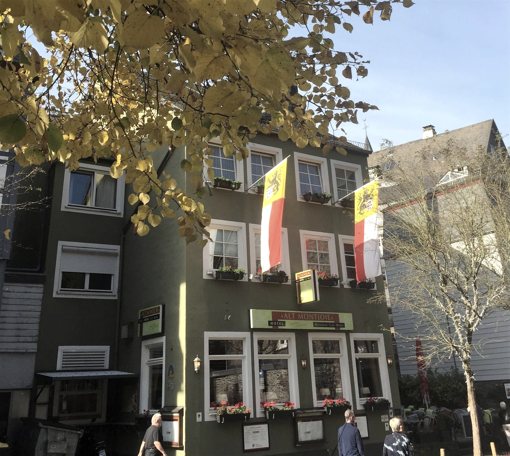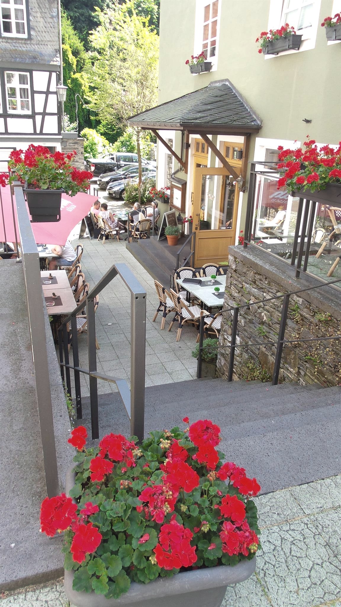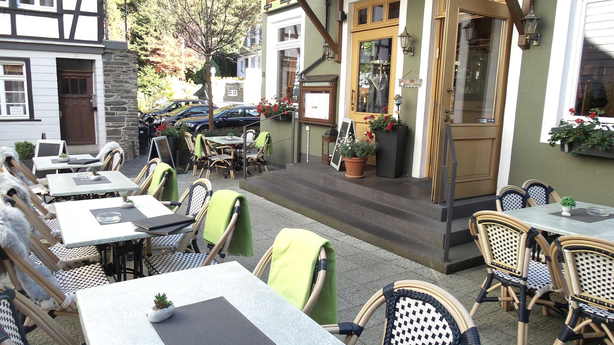 "Wir sind in Monschau, machen Sie mit...", typisches Eifelkulinarium, gepaart mit ländlicher Unbeschwertheit erwartet Sie bei uns zu jeder Jahreszeit, ob im Frühling zur Narzissenblüte, im Sommer zur Monschauer Kermes oder zum Oldtimer-Treffen, im Herbst zu Wanderungen durch die herbstlich gefärbten Buchenwälder oder im Winter zu Glühwein und Weihnachtsmarktflair - Wir freuen uns auf Ihren Besuch - 120 sonnige Terassenplätze und 55 Plätze im Restaurant laden zum Verweilen und Schlemmen ein.