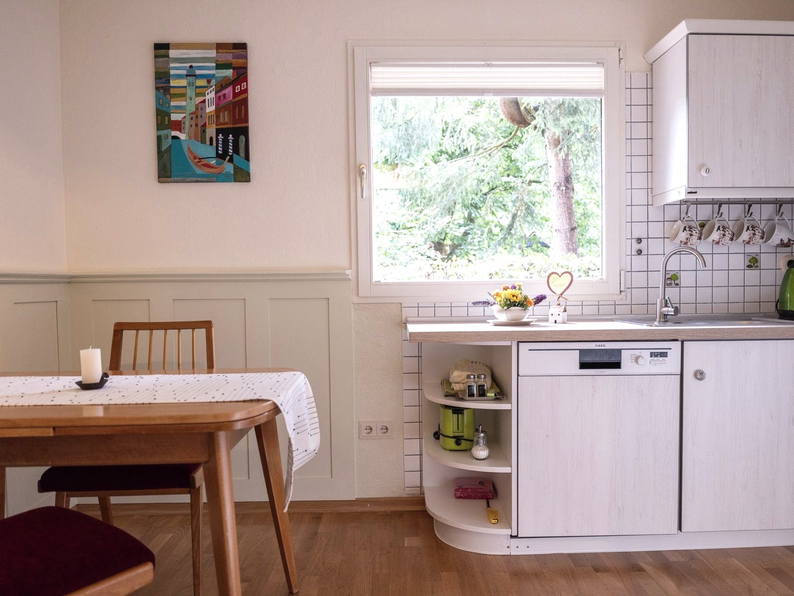 In der modernen Küche finden Sie alles, was Sie zum Kochen brauchen: eine Spülmaschine, Ceran-Kochfeld mit Backofen, Kühlschrank, Mikrowelle, Wasserkocher und wahlweise einen Kaffeevollautomaten oder eine klassische Filtermaschine. Geschirr, Gläser, Besteck, Töpfe, Pfannen und Küchenhelfer sind natürlich auch vorhanden – so können Sie nach Lust und Laune kulinarisch kreativ werden.