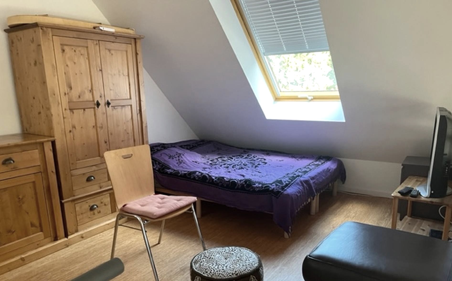 Die Ferienwohnung LichtRaum ist über die Außentreppe zugänglich. Unter dem LichtRaum befindet sich der Pferdestall und die Sattelkammer.
