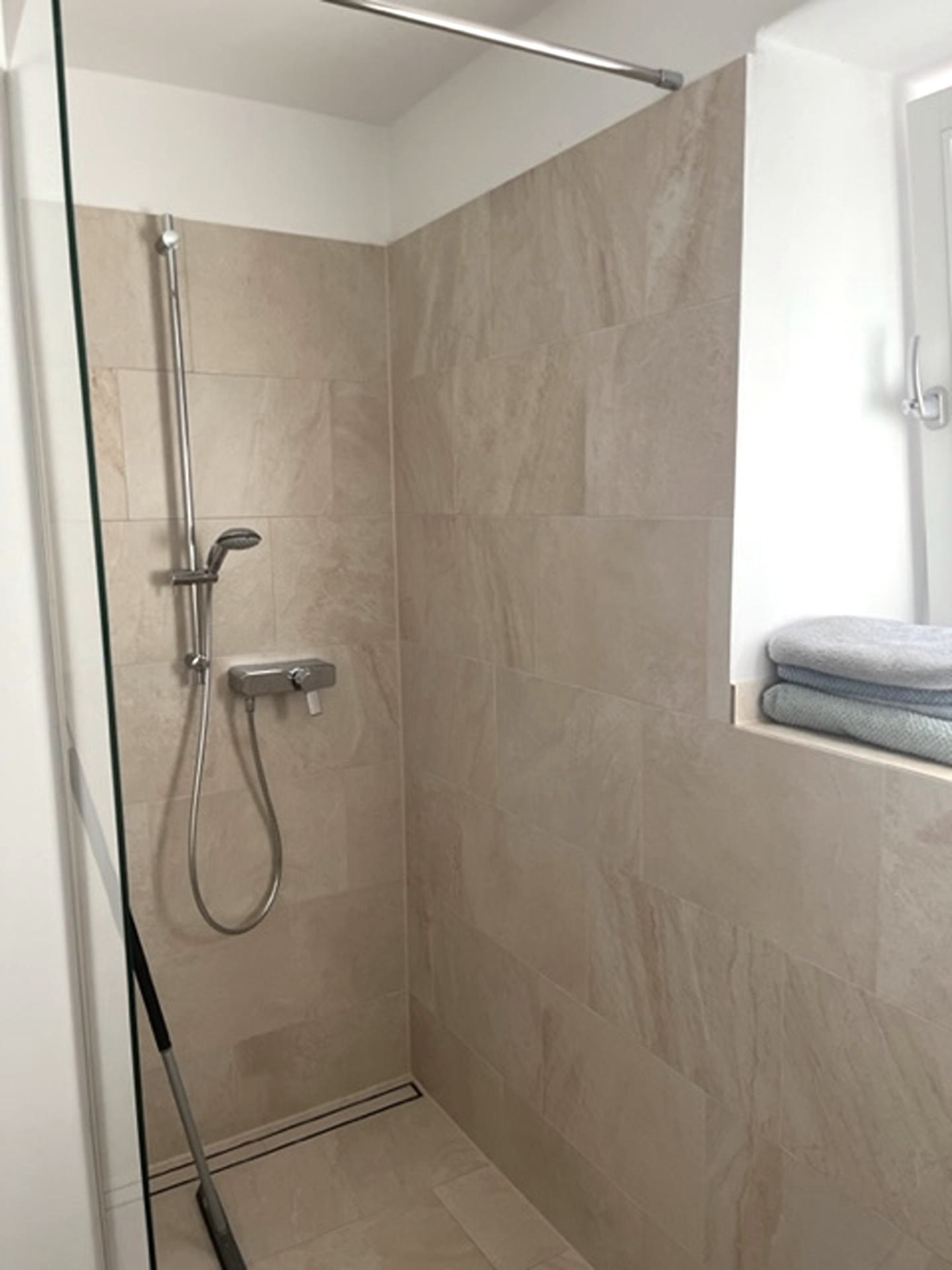 Zwei Stufen führen zur offenen Küche runter mit angrenzendem Duschbad welches eine Bodengleichen Dusche hat.