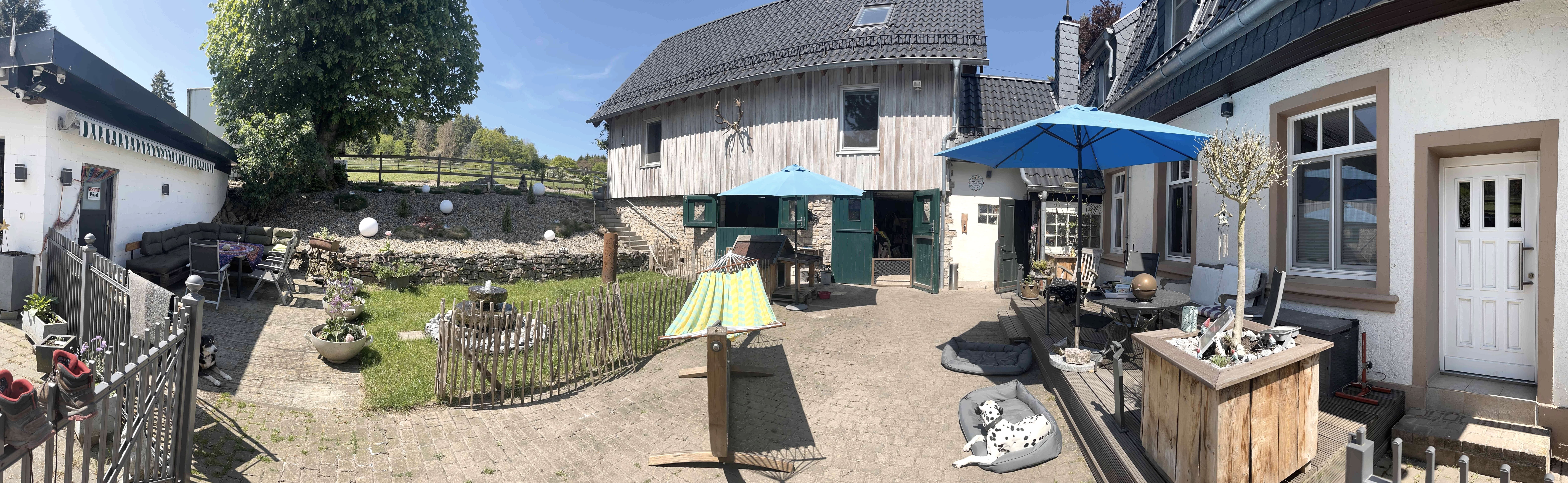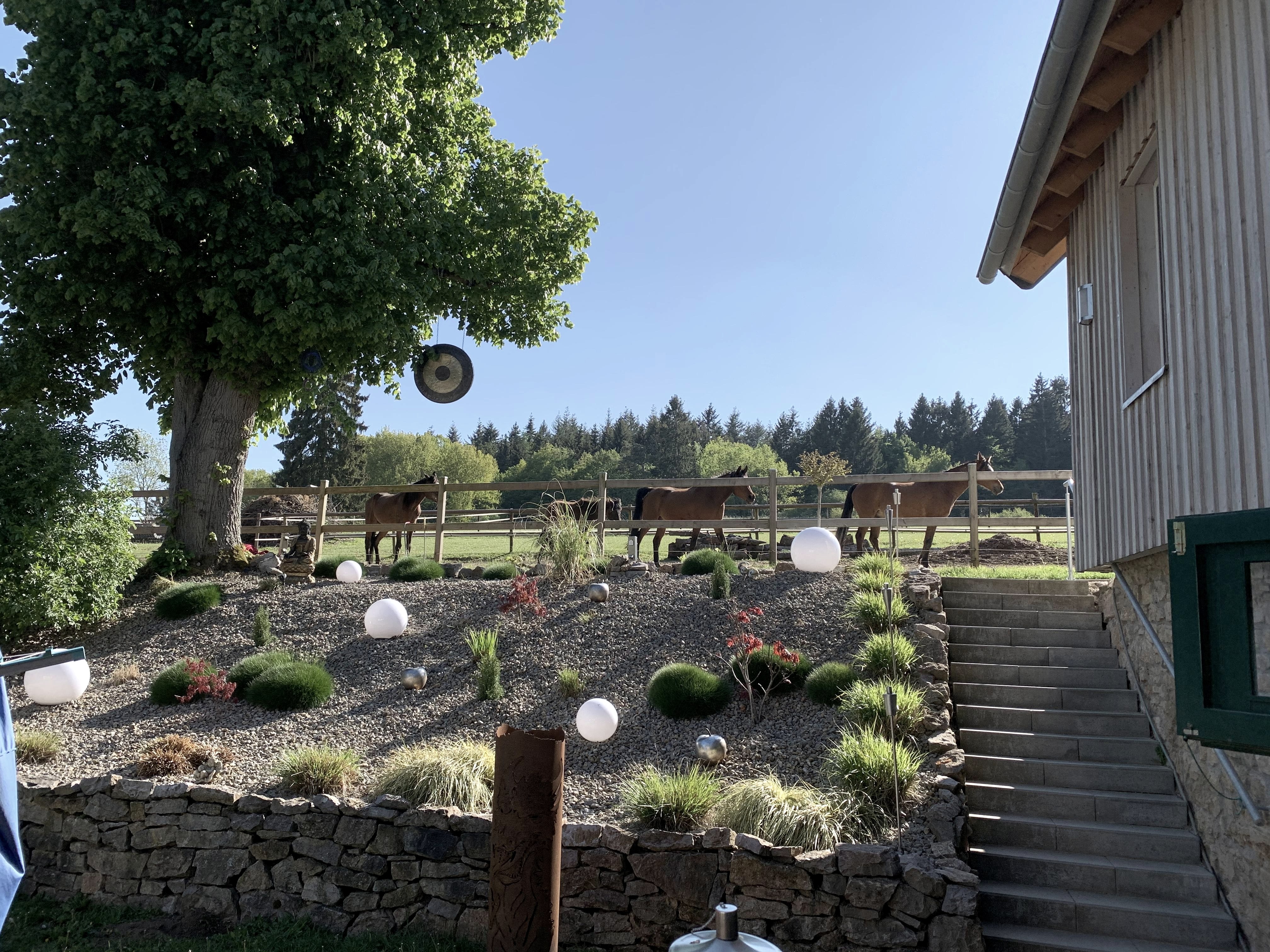 Ihr Blick schweift über die Wiesen, wo sich Hase und Igel „gute Nacht“ sagen, bis hoch zum Waldrand oder in unseren Innenhof mit unserem Mühlstein-Springbrunnen.