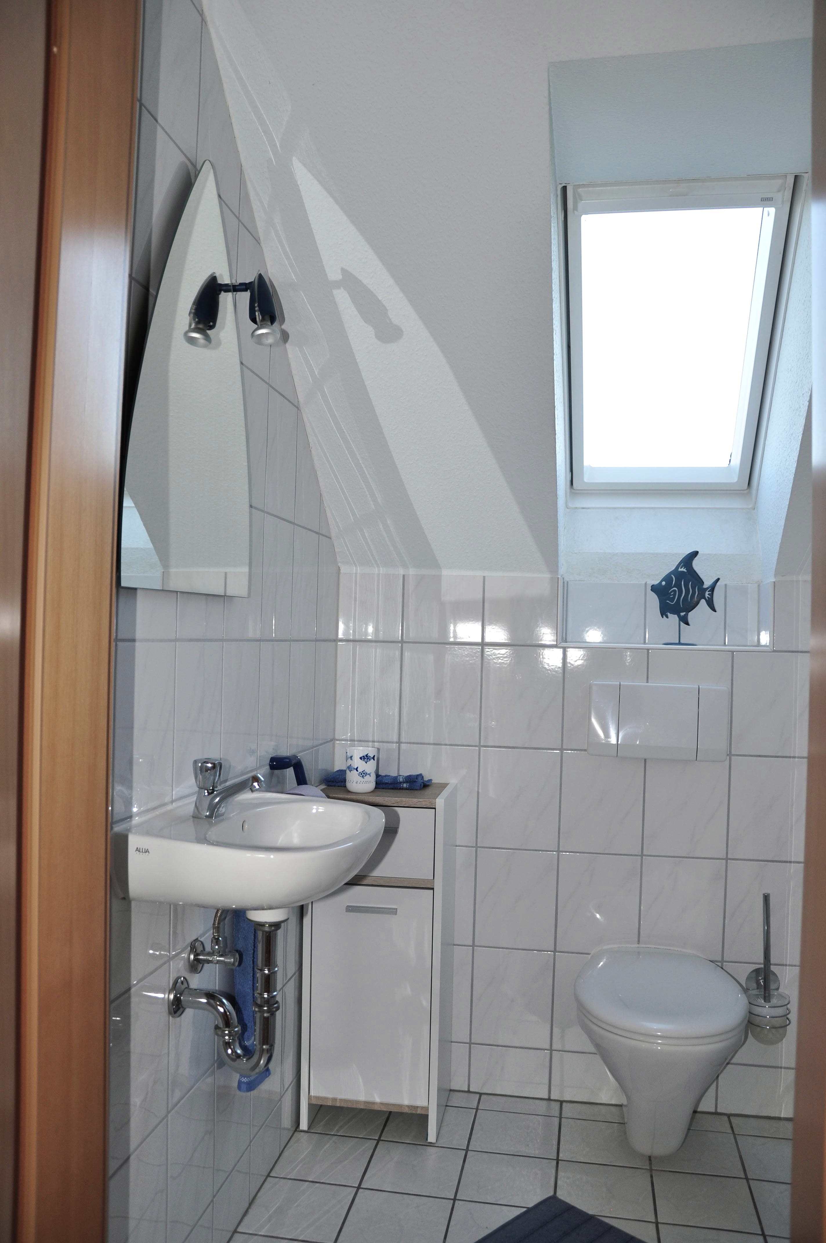 Das Tageslicht-Bad verfügt über eine ebenerdige Dusche, WC und Waschbecken. Weiterhin steht eine separates WC mit Waschbecken zur Verfügung.