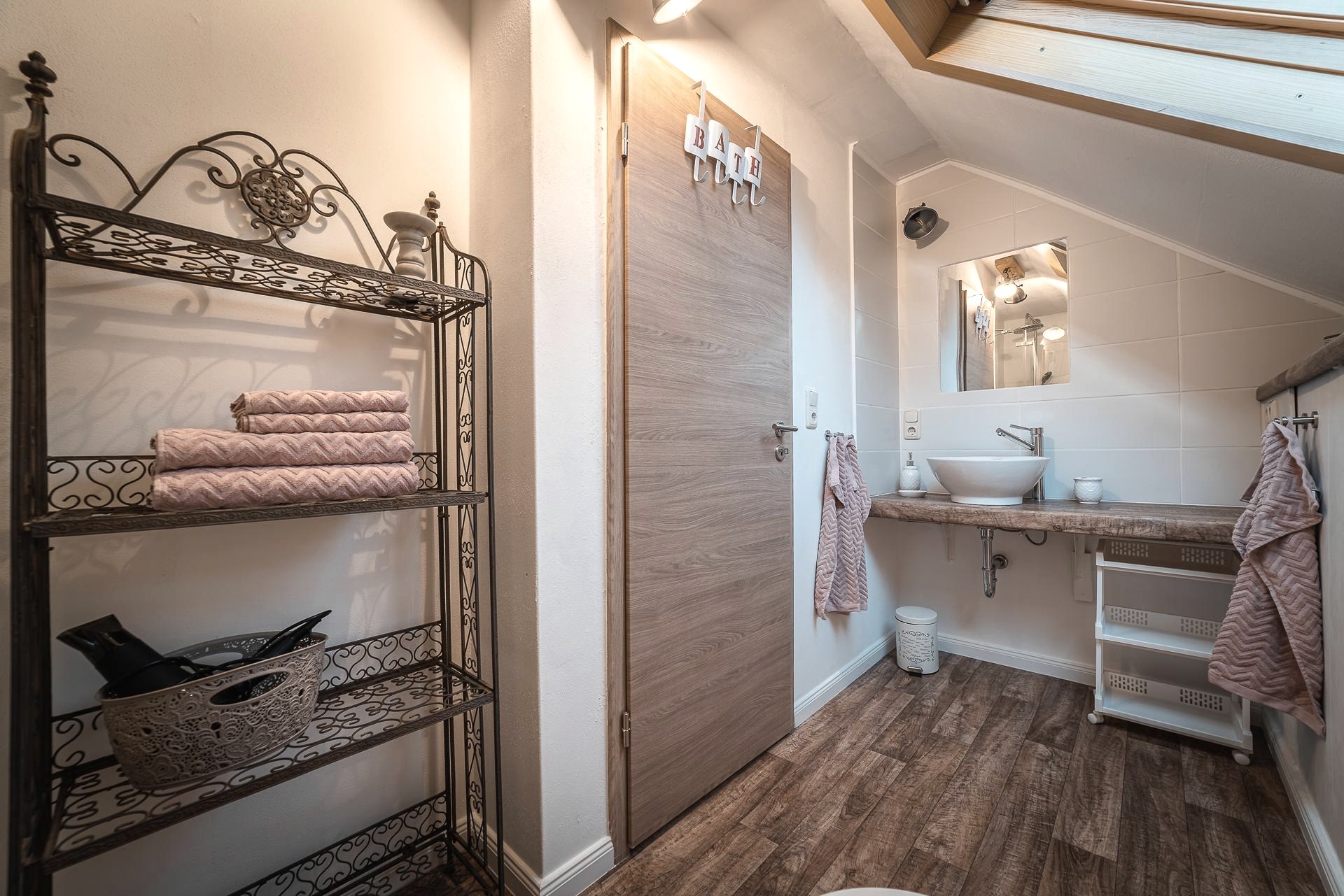 Im Obergeschoss befinden sich 4 Schlafzimmer und ein Badezimmer. Die Schlafzimmer sind mit Doppelbetten (2 x 1,80 x 2,00m / 2 x 1,60 x 2,00m) und jeweils einem Smart-TV ausgestattet. Ein Zimmer ist als Schlaf- und Spielzimmer kombiniert, mit Poolbillard-Tisch und Schrankbett, das bei Bedarf hoch und wieder hinuntergeklappt werden kann. Mit der Schlafmöglichkeit im Wohnzimmer, können somit bis zu 10 Personen einen angenehmen Urlaub im Sommerhaus verbringen. Ein Kinderbett kann bei Bedarf zur Verfügung gestellt werden. Das Bad im Obergeschoss ist mit WC, Waschbecken und Dusche und natürlich einem Fön ebenfalls voll ausgestattet.