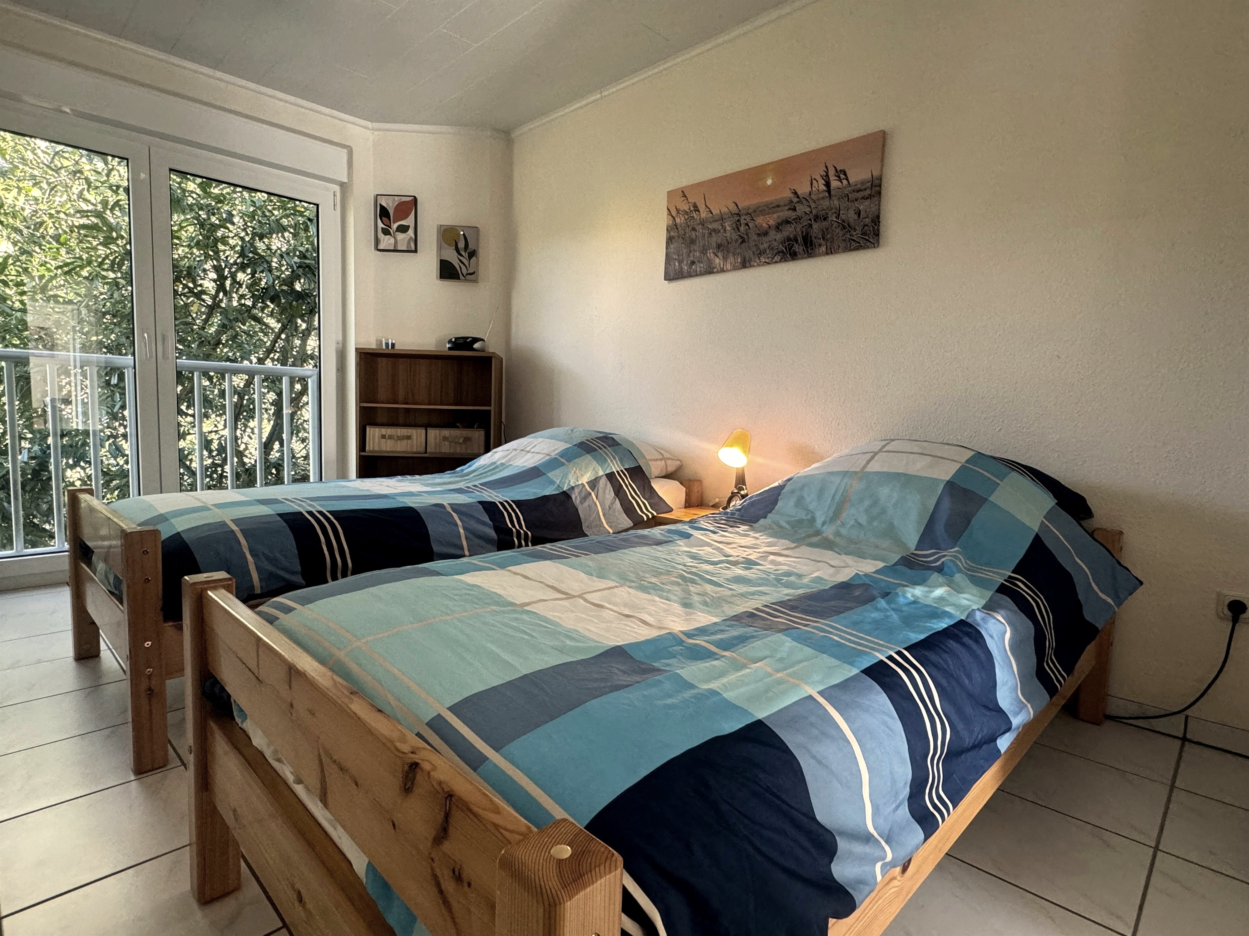 Vom Balkon aus haben Sie den schönsten Blick auf das Dorf, über die wunderschöne Berglandschaft der Eifel. Die Wohnung verfügt über zwei Schlafzimmer mit einem Kingsize-Doppelbett (2 mal 2 Meter) und zwei Einzelbetten.