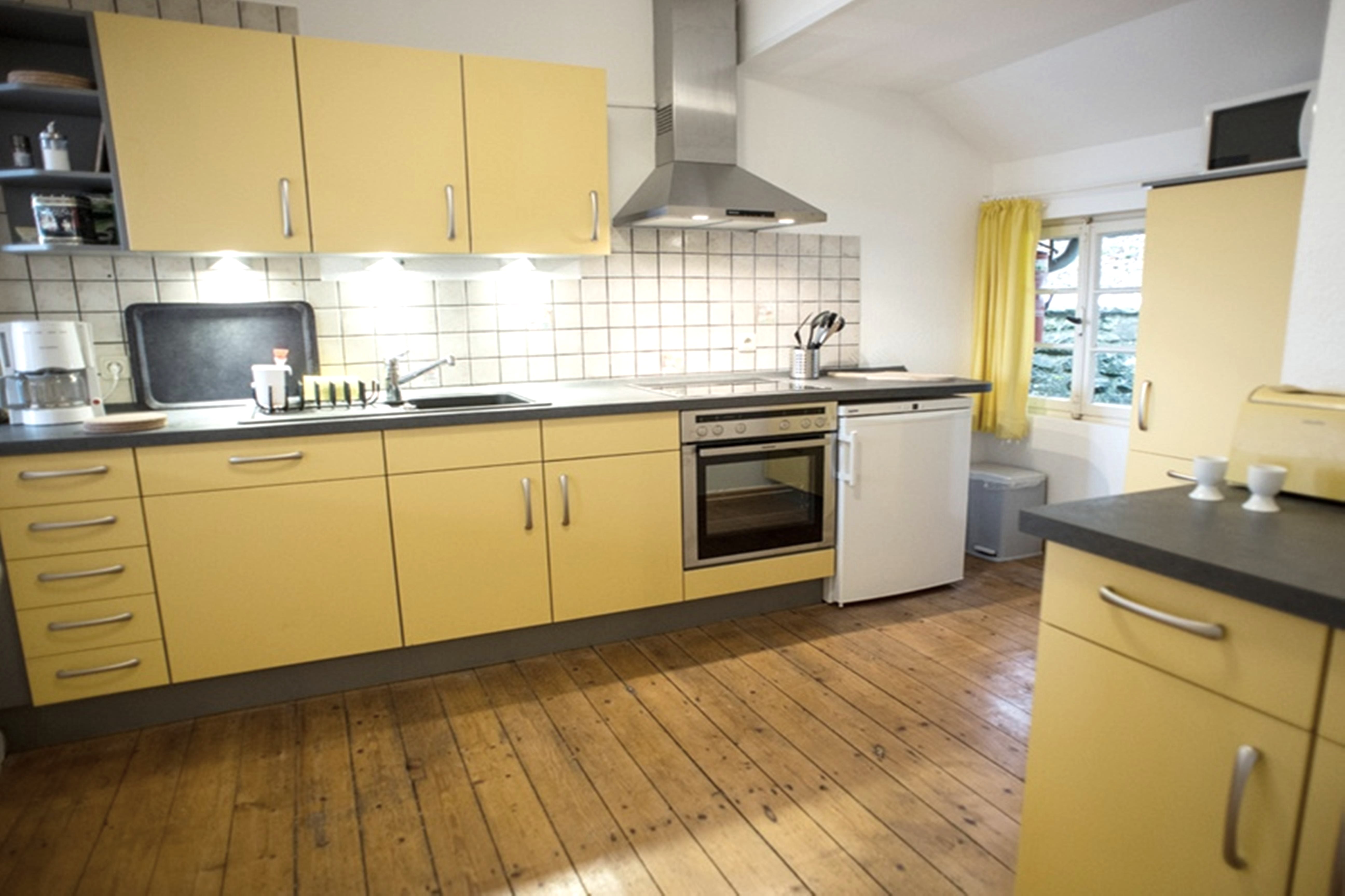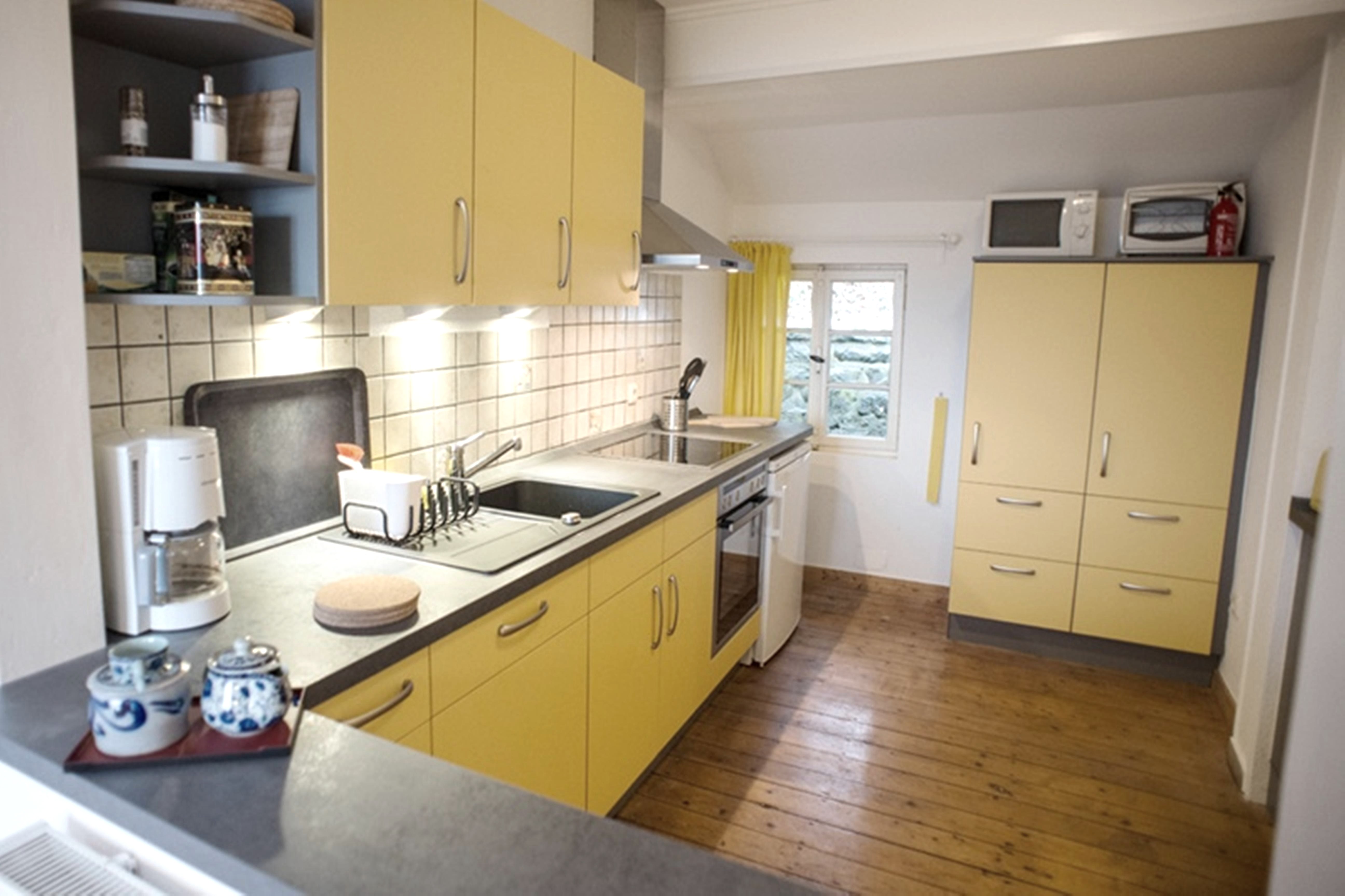 - Küche mit Geschirrspüler, Backofen, Mikrowelle, Kühlschrank mit Gefrierfach und Filterkaffeemaschine