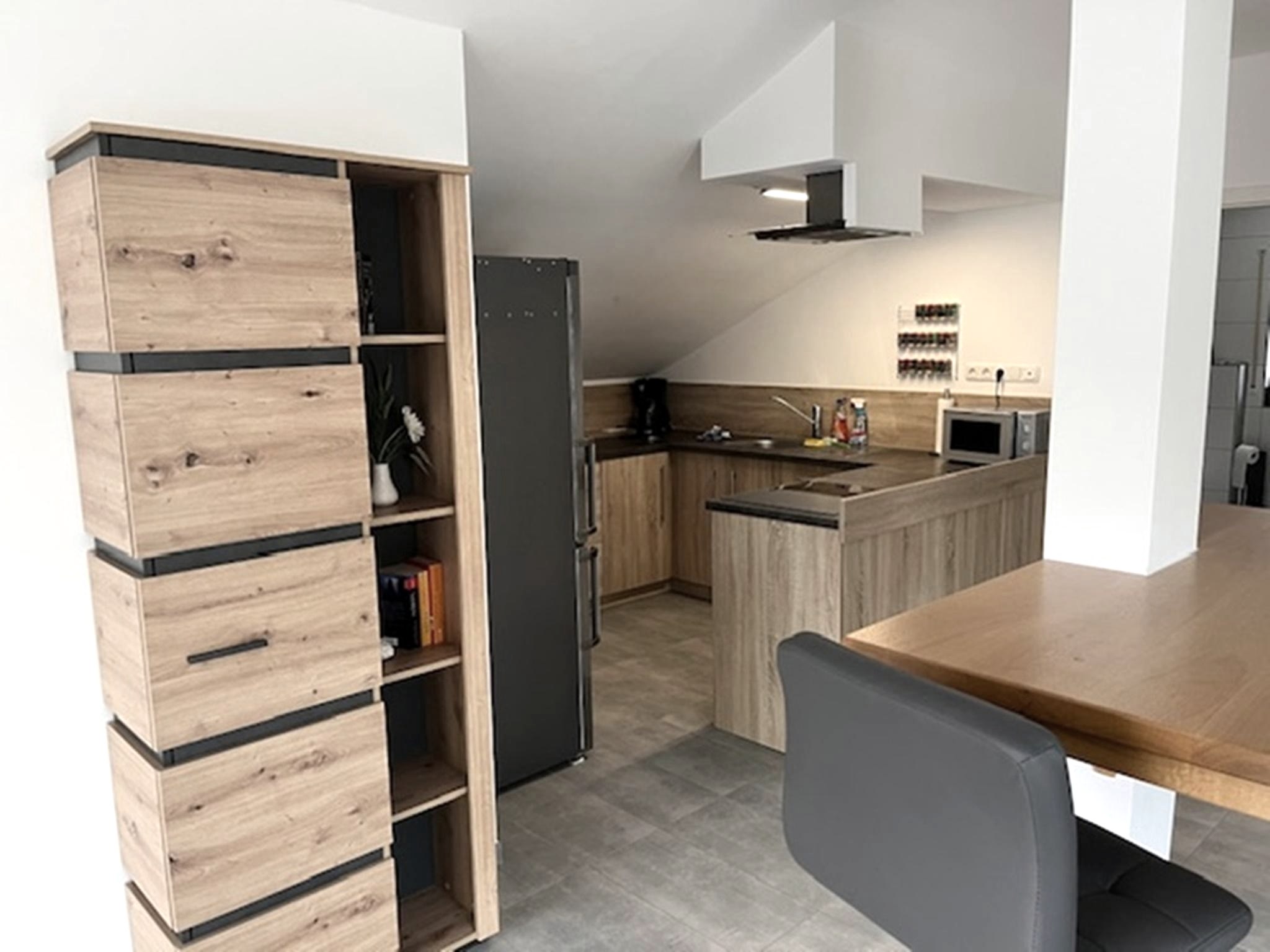 • Küche mit Essbereich, Spülmaschine, Backofen, Ceran-Kochfeld, Mikrowelle,
