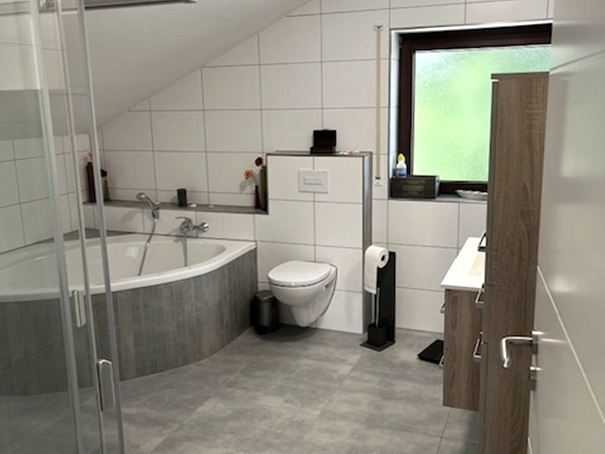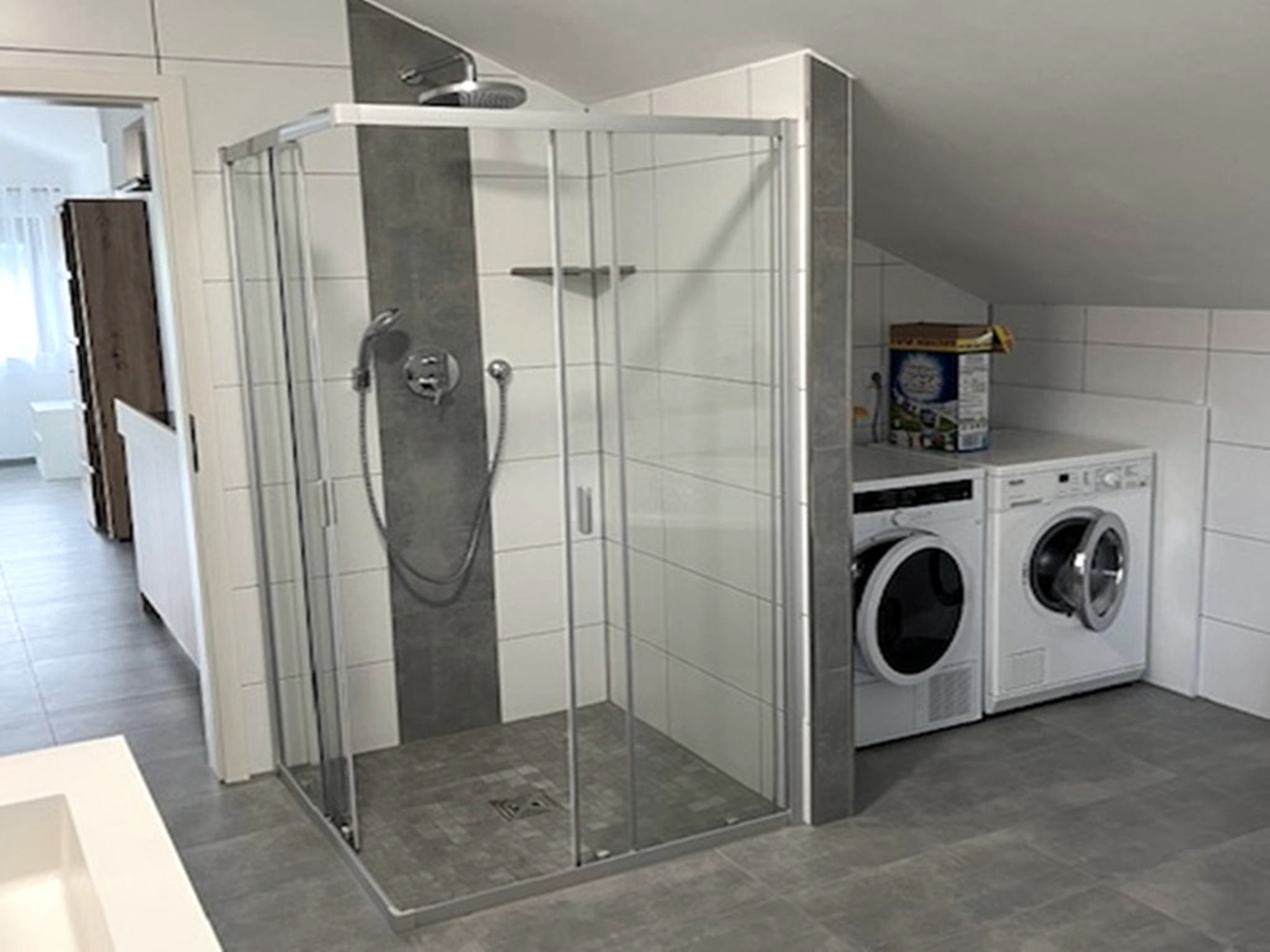 • Bad mit Dusche, Badewanne, WC und Waschbecken, Waschmaschine und Trockner