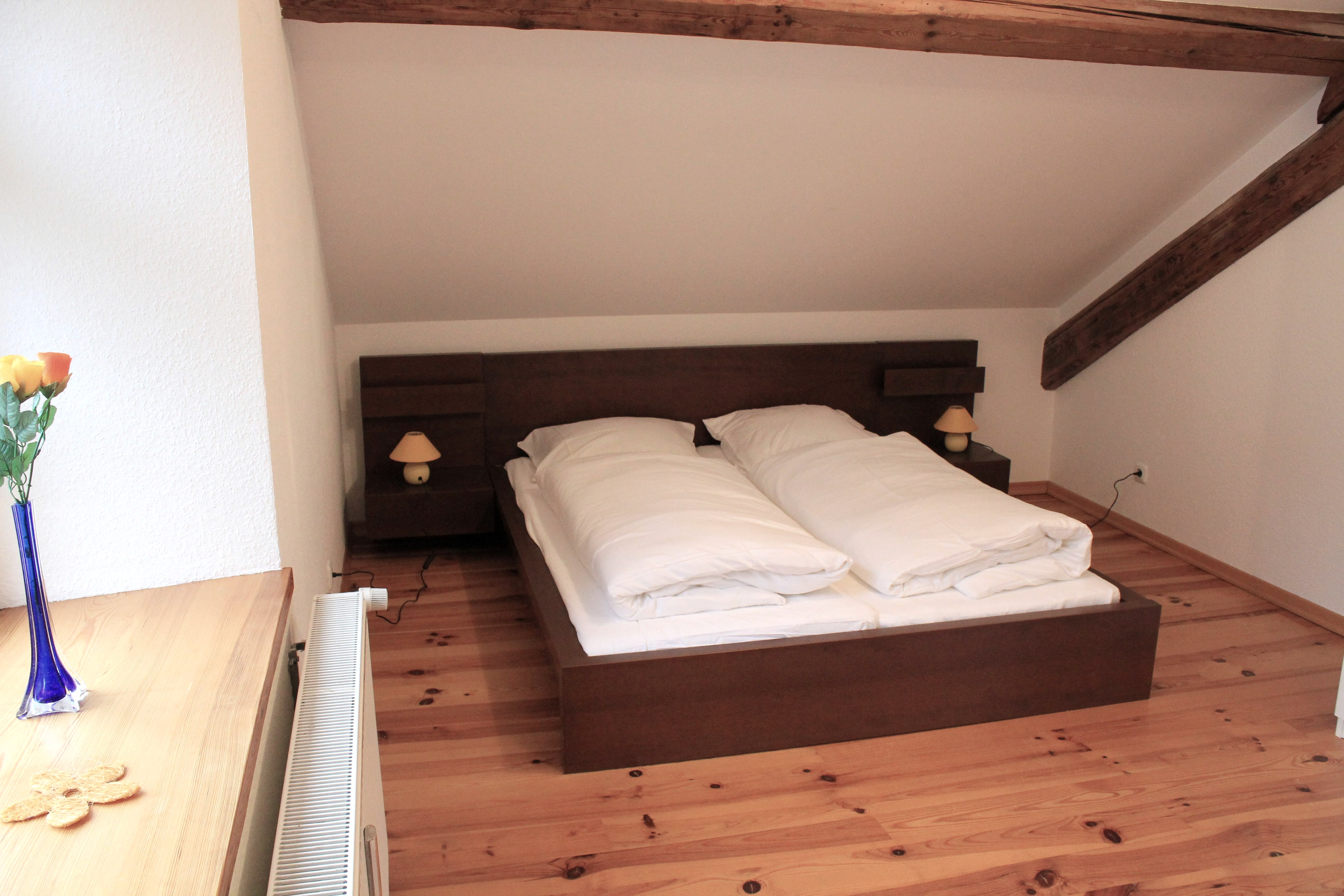 Im Schlafbereich gibt es zwei Doppelzimmer und ein Dreibettzimmer. Auf einer offenen Empore kann zusätzlich ein Klappbett aufgestellt werden.