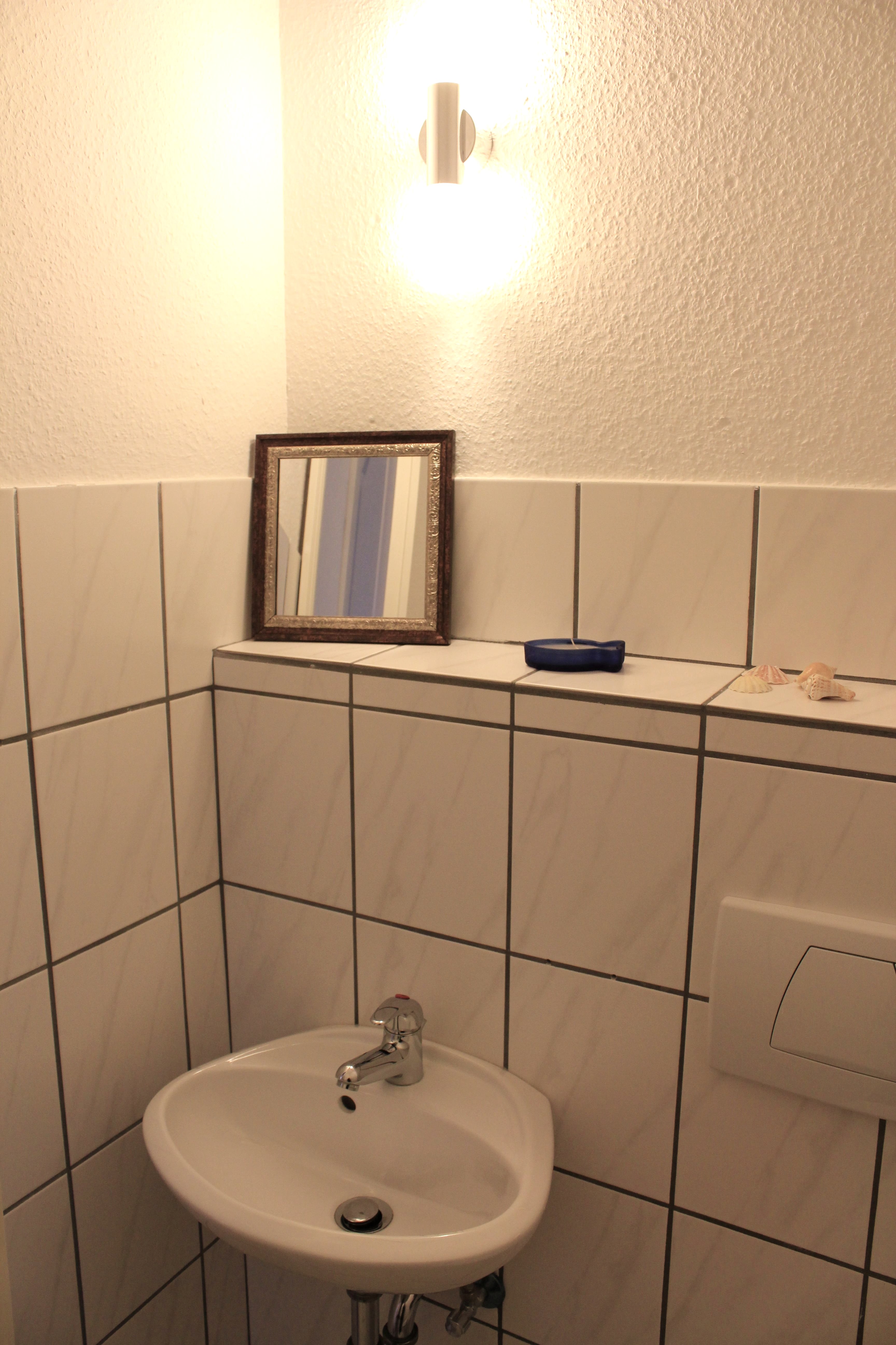 Es gibt ein Bad mit WC, Waschbecken und Duschwanne. Zusätzlich gibt es ein WC mit Waschbecken.
