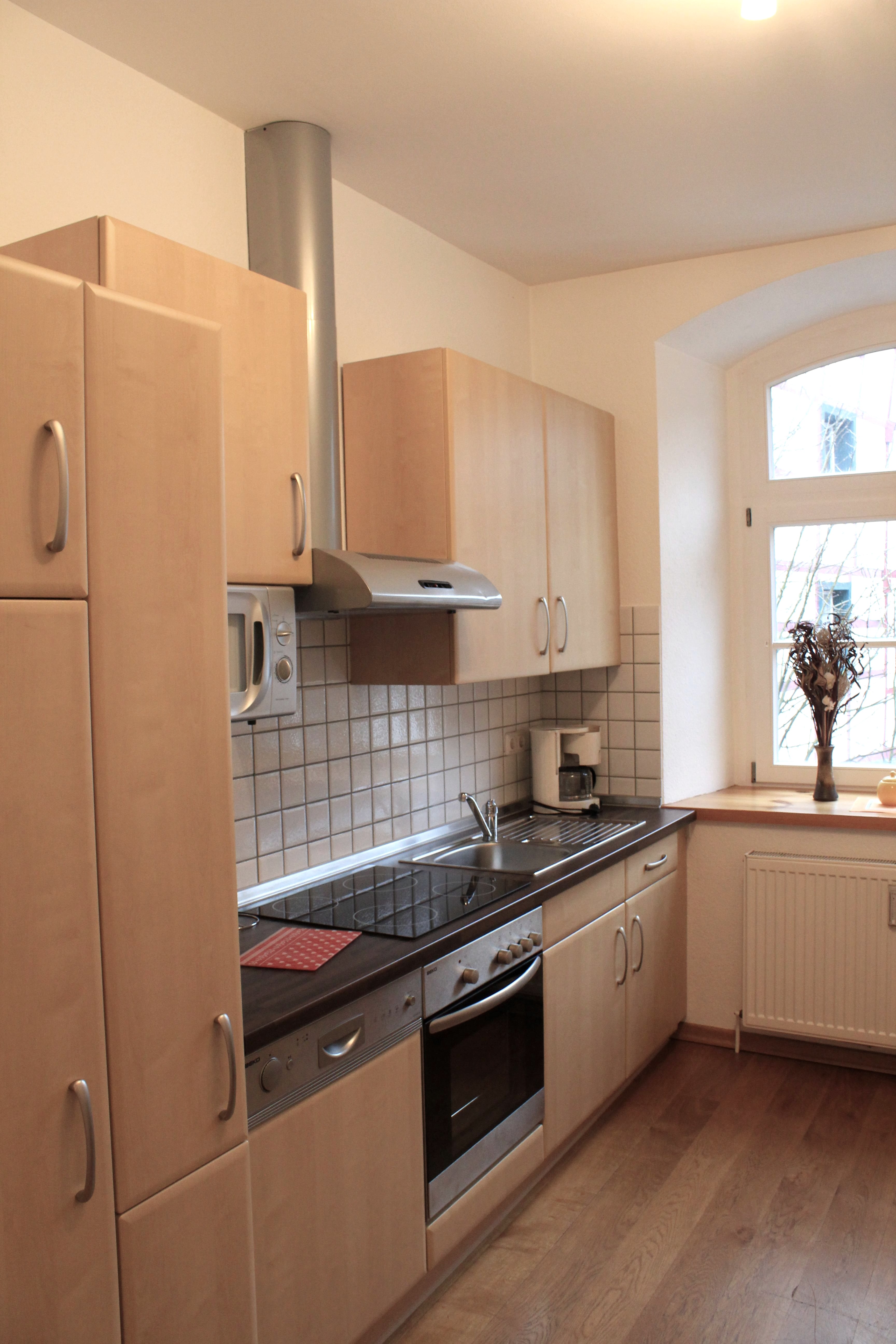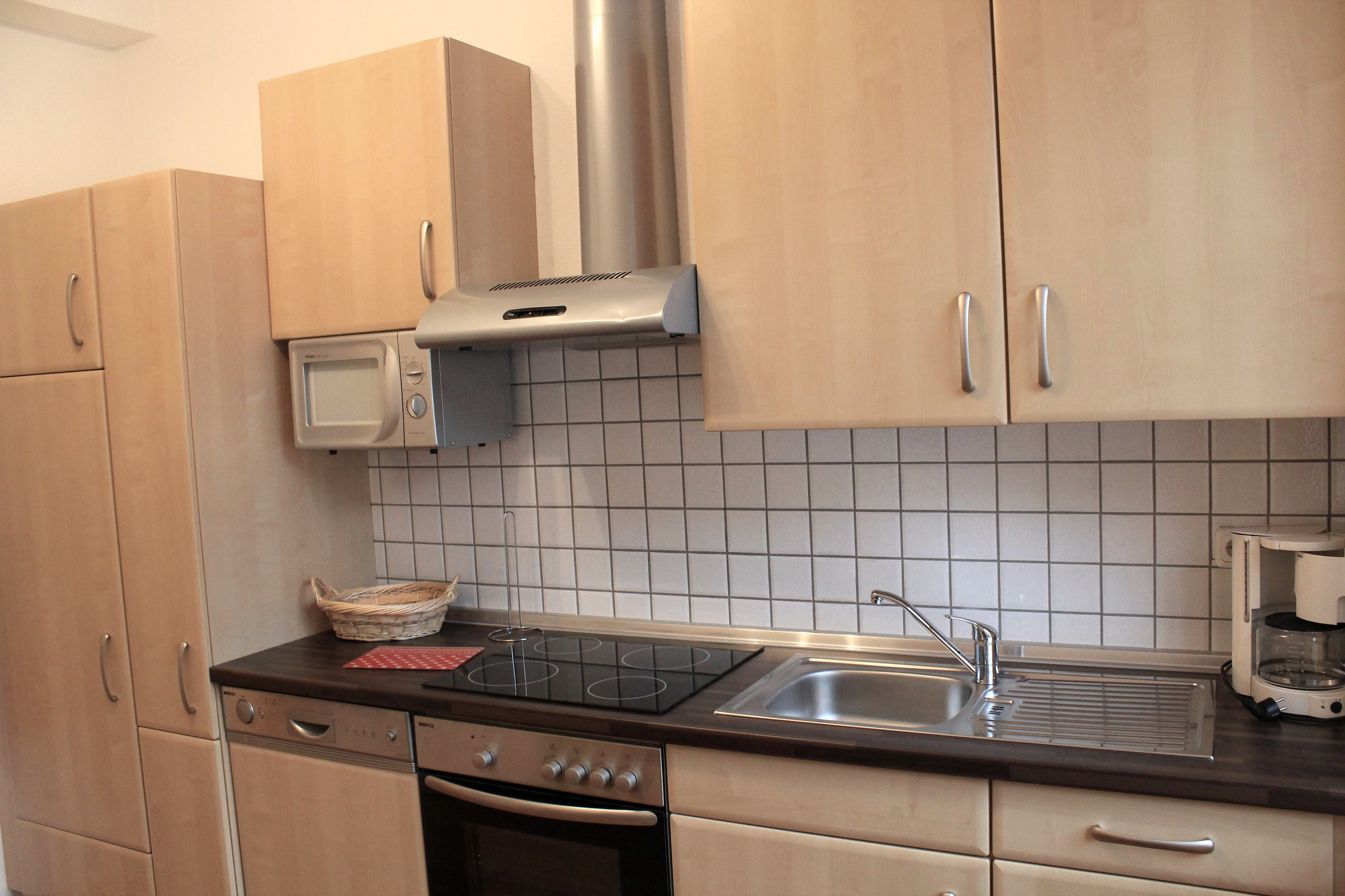 - Einbauküche mit Spülmaschine, Backofen, Mikrowelle, Kühlschrank mit Gefrierfach und Filterkaffeemaschine